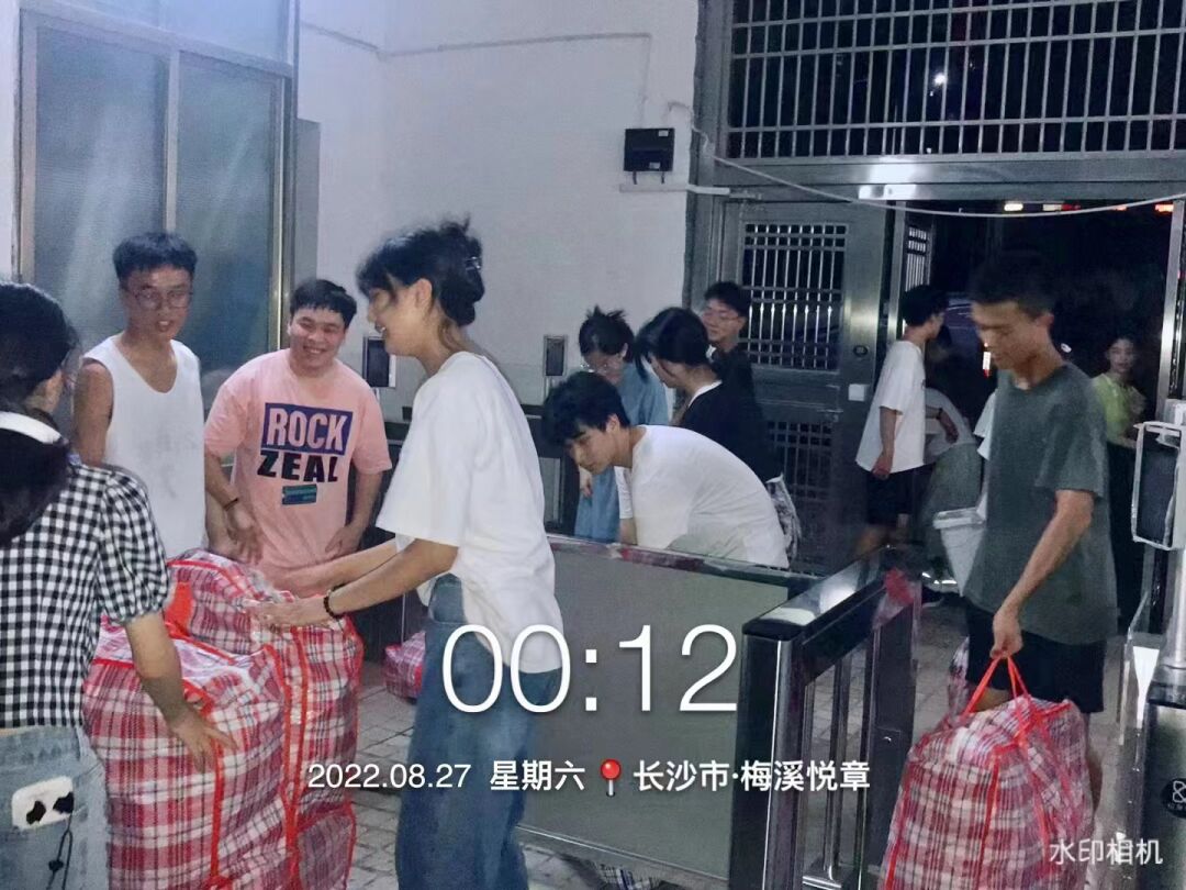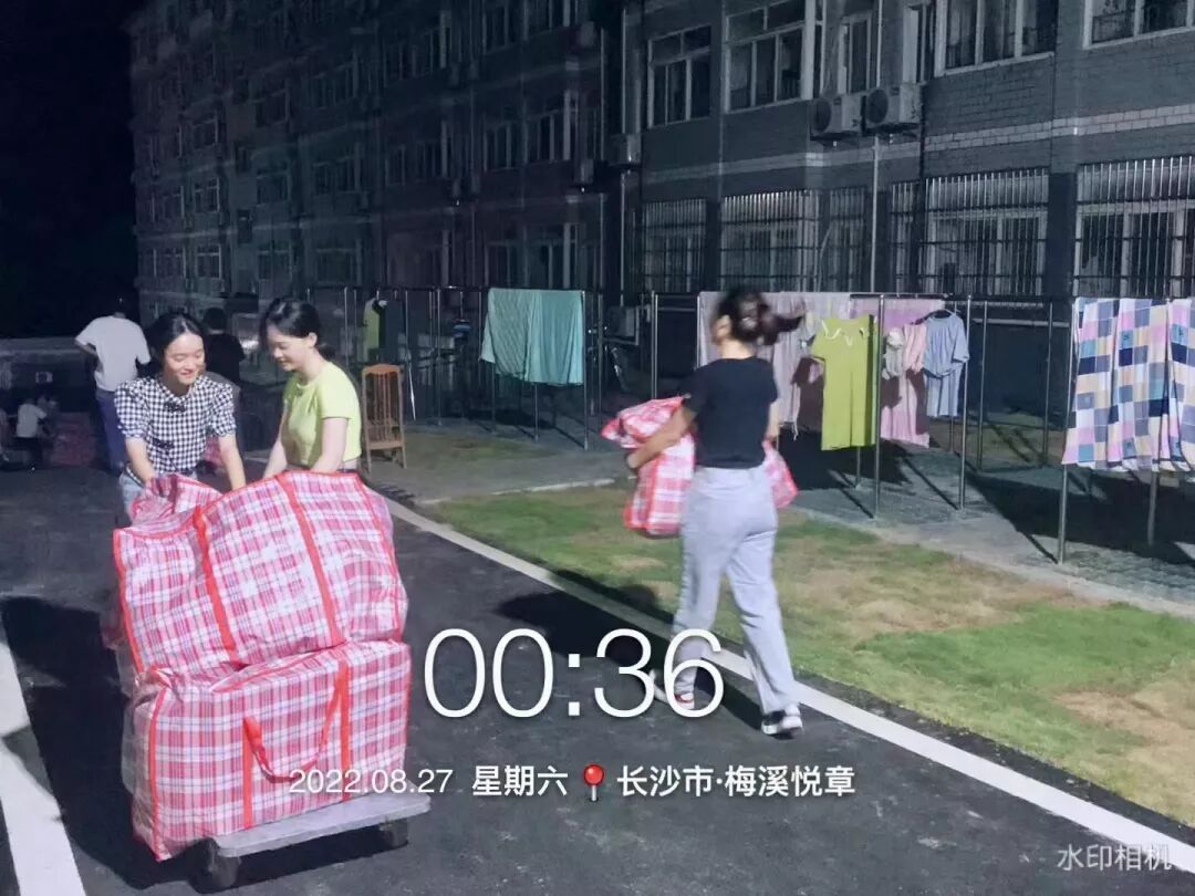 当日凌晨,新生的行李被集中放置在2栋公寓楼门口。搬迁过程中,志愿者们用板车推、用肩膀扛,将行李整齐地摆放在新生公寓的楼道里。大家干的热火朝天,即使浑身被汗液浸透也没有停下扛着行李奔跑的脚步。工作结束,已近凌晨3点,曾琳娜老师赞扬道:“大家辛苦啦!今晚看见大家汗流浃背、埋头苦干的样子,不管男孩女孩,没有一个喊累喊苦,真的被你们深深感动!同学们都是好样的,你们是物化院的光荣与骄傲,你们是能战斗的物化人,谢谢你们!”