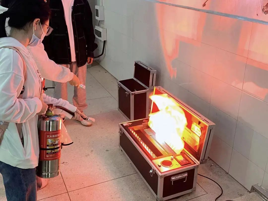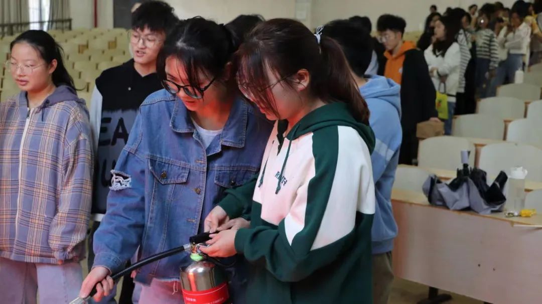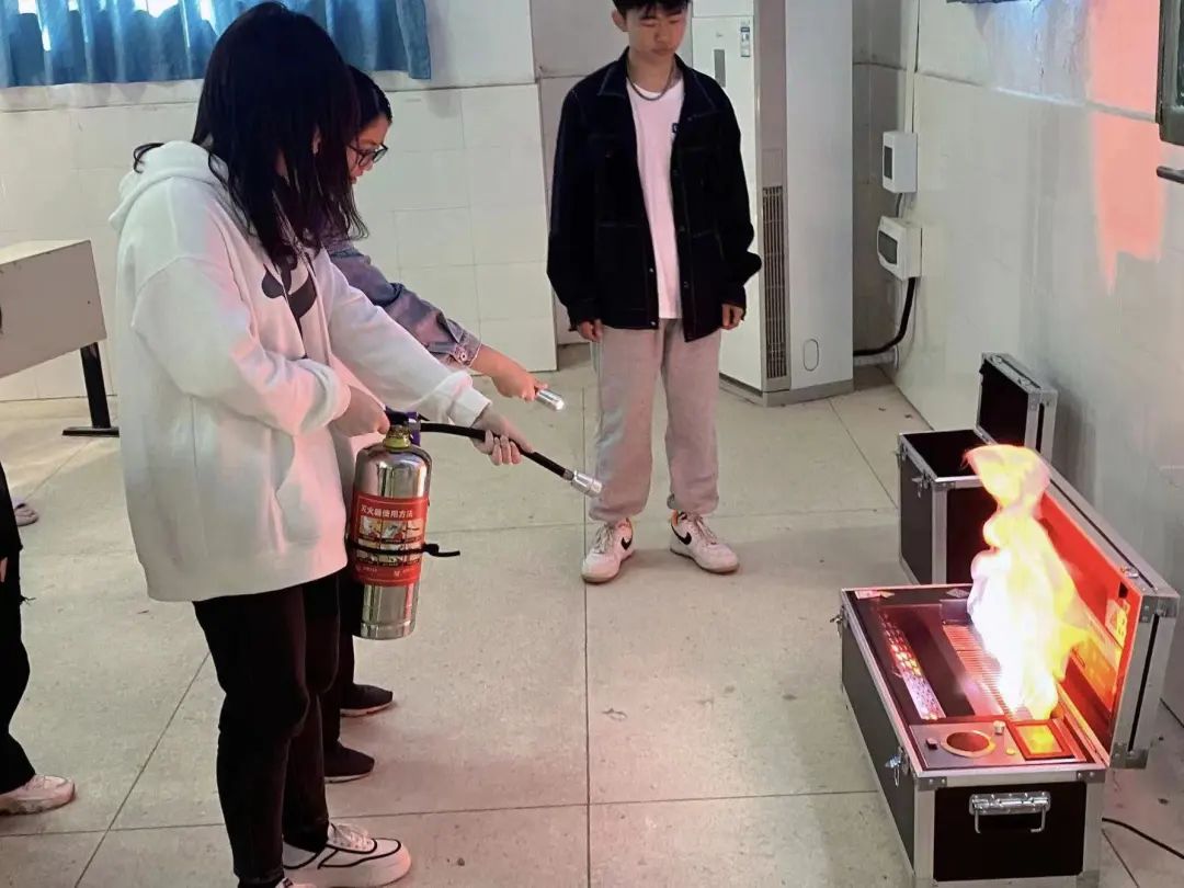 演练活动中,宿保部同学首先进行灭火模拟演练示范,介绍了灭火器的使用、灭火注意事项等知识。之后同学们以班为单位有序开展实战灭火演练。一提,二拔,三喷,随着同学们有条不紊的动作,“熊熊燃烧”的火焰瞬间被灭火器喷出的“白雾”笼罩,只余“火星”缓缓消灭。整个过程紧张有序,同学们态度严肃认真,活动开展十分顺利。