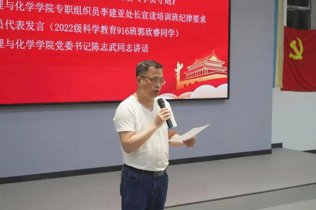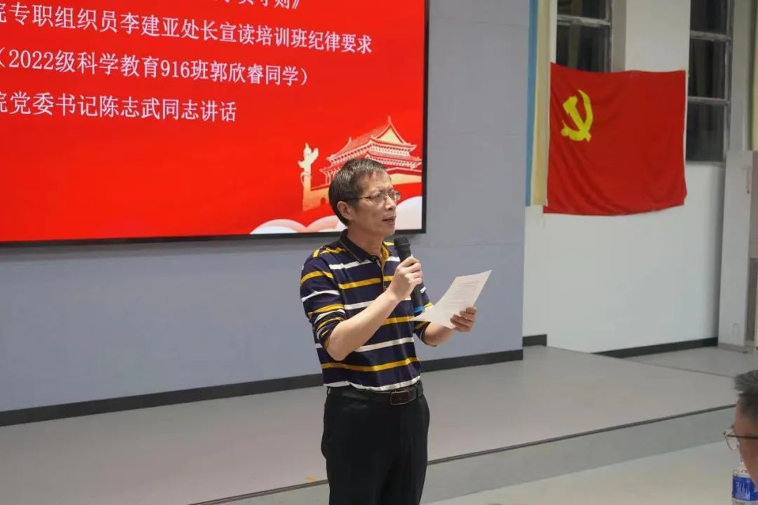 接下来,教育公司党委副书记张志新宣读《学员守则》,并希望入党积极分子以身作则,在学习与生活中都要做好带头模范作用。bevictor伟德官网专职组织员李建亚宣读“培训班纪律要求与学员安排”,强调入党积极分子应当遵守培训纪律,认真面对本次培训,不负时代的期待。随后,2022级科学教育917班郭欣睿同学代表学员发言。