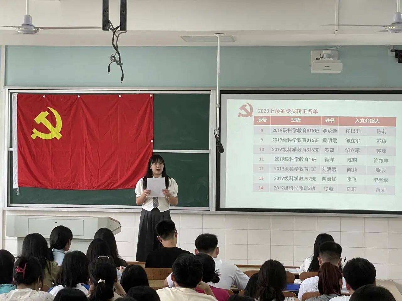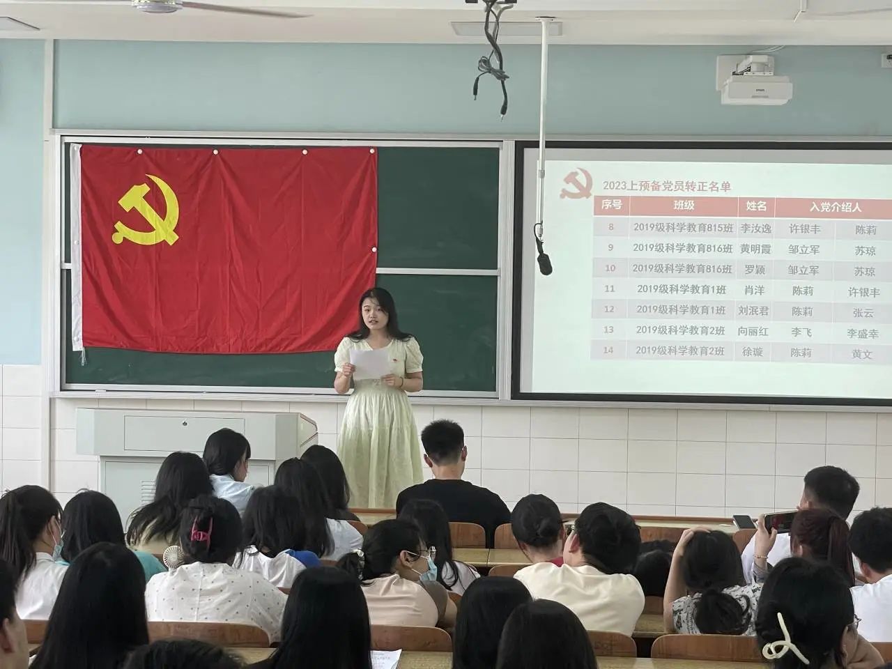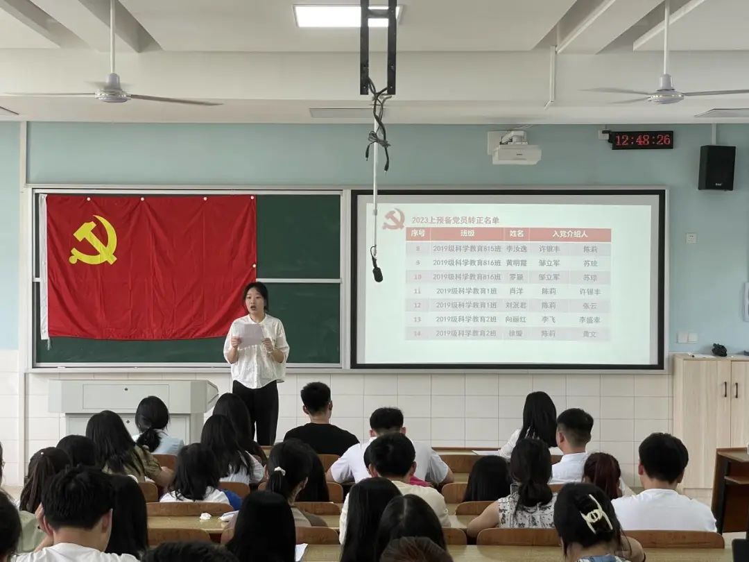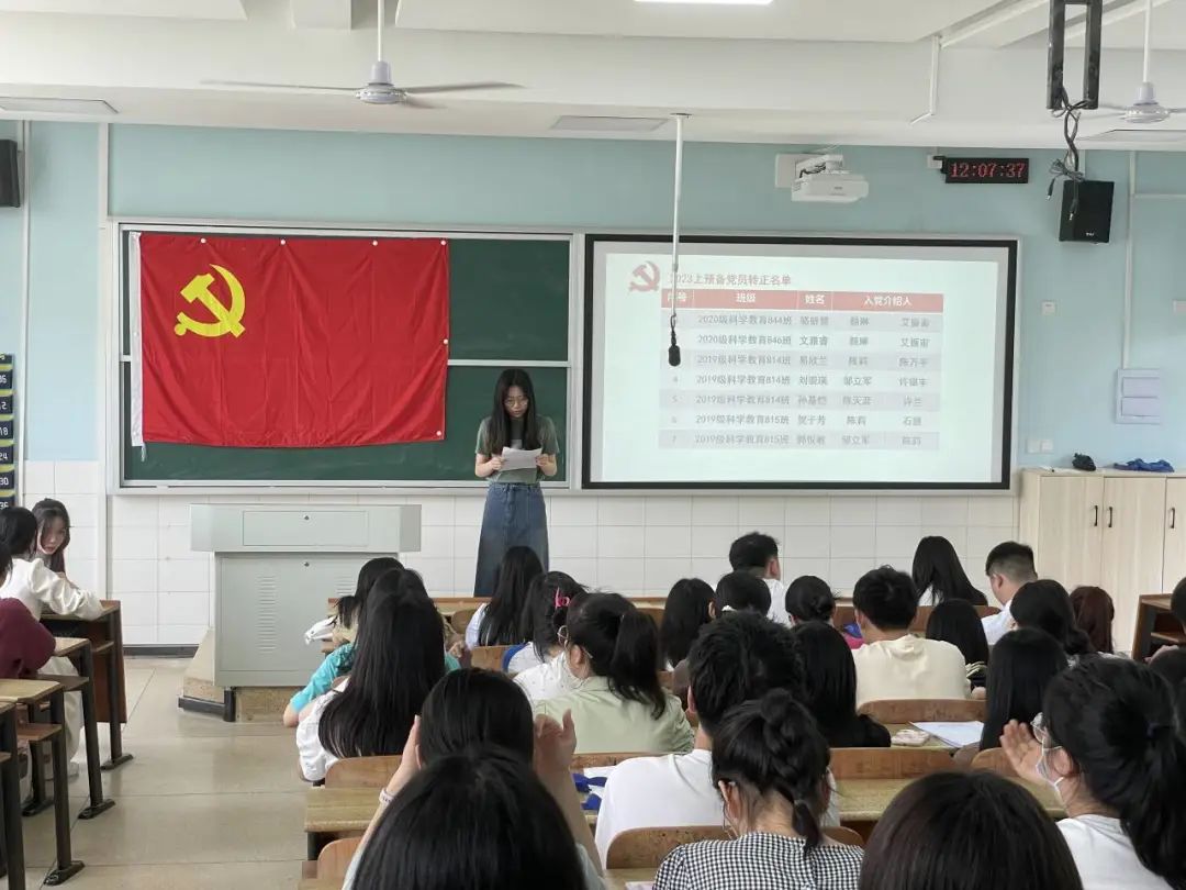 在支部书记曾琳娜老师的组织下,拥有表决权的28名党员对各预备党员进行投票表决,最终全体党员一致同意易欣兰、刘崇瑛等18名预备党员转为中共正式党员。