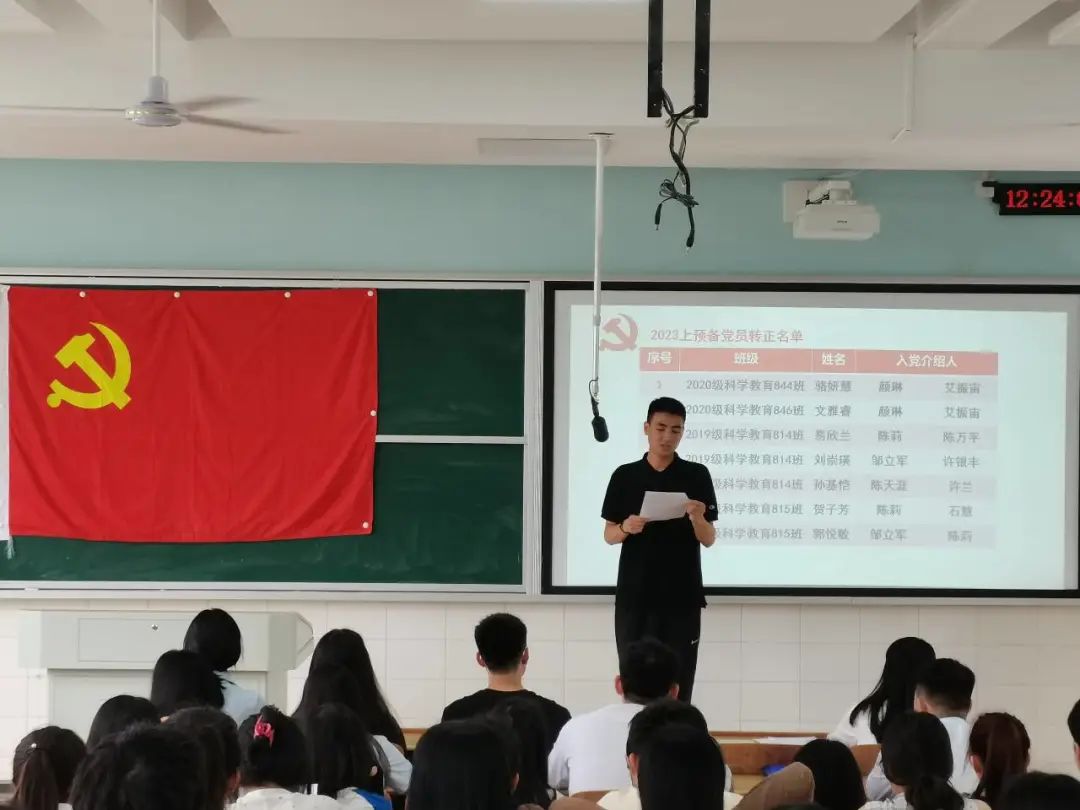 首先,支部工作人员清点到会人数,接着通过举手表决,确定了监票人为曾琳娜老师和陈芋霖同志,计票人为李兴欢、李佩玲同志。此次会议严格按照预备党员转正的程序进行。