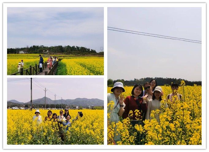 随后,来到茶亭的万亩油菜花田,当金灿灿的花海跃入眼帘时,连绵起伏的油菜花田与湛蓝晴空相映成趣,涌动成一片金色的海洋。参与者在田间步道缓步而行,用镜头定格春日记忆。午餐后,各工会小组开展了花海中的科学密码、物理趣味挑战赛和化学元素接力赛等趣味活动,在“花海中的科学密码”环节,老师们通过扫描植物标识牌,学习花卉色素成分、光合作用原理等知识,并结合专业展开讨论;物理趣味挑战赛上,各组利用简易材料完成“平衡力挑战”“光的折射实验”,将课堂知识融入自然实践。化学系陈教授笑称:“平时在实验室研究分子结构,今天用树枝搭模型,倒是另有一番乐趣!”