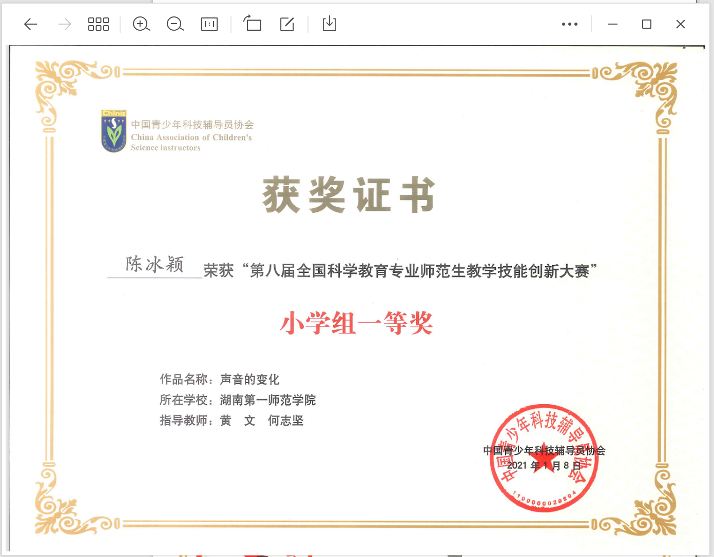 黄文、何志坚指导陈冰颖同学获“第八届全国科学教育专业师范生教学技能创新大赛”小学组一等奖