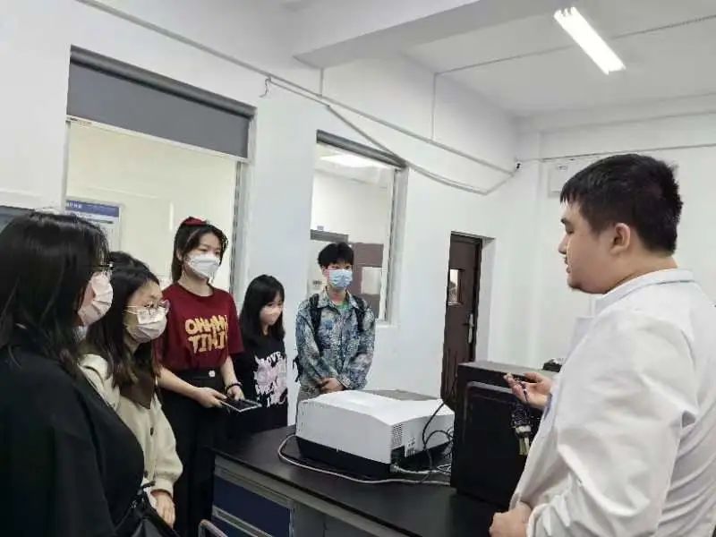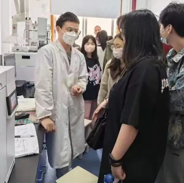 在参观过程中,苏胜培教授和周子虬副主任详细介绍了有机分子合成实验室内的各种实验设备,并调动员工们对于有机实验合成过程的思考。有机功能分子合成仪器室管理人周旺老师向一师学子介绍了相关仪器的使用方法和相应的原理,让员工们了解到不同性质的物质需要使用不同实验设备的原理。湖师大有机化学专业研二员工详细地介绍了色相质谱仪的使用原理和数据分析方法,并现场演示了有机试剂的分离、提纯实验,让员工们近距离地感受到了有机化学实验的魅力。